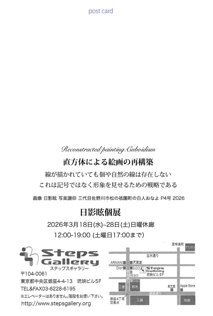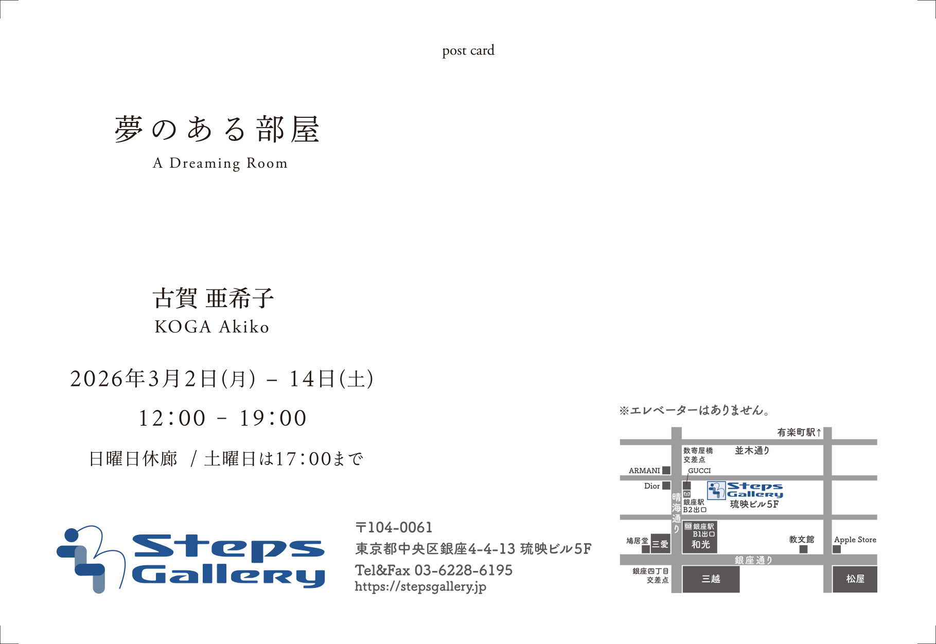 時間:12:00 – 19:00(日曜休廊、土曜日は17:00まで)